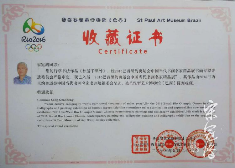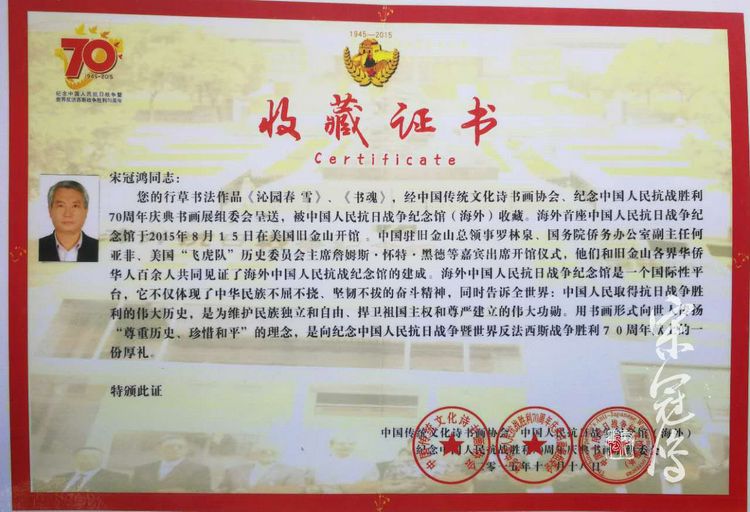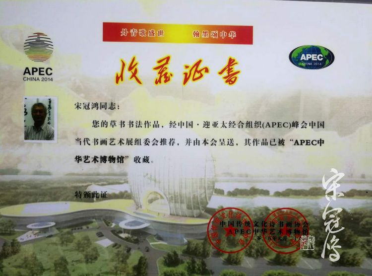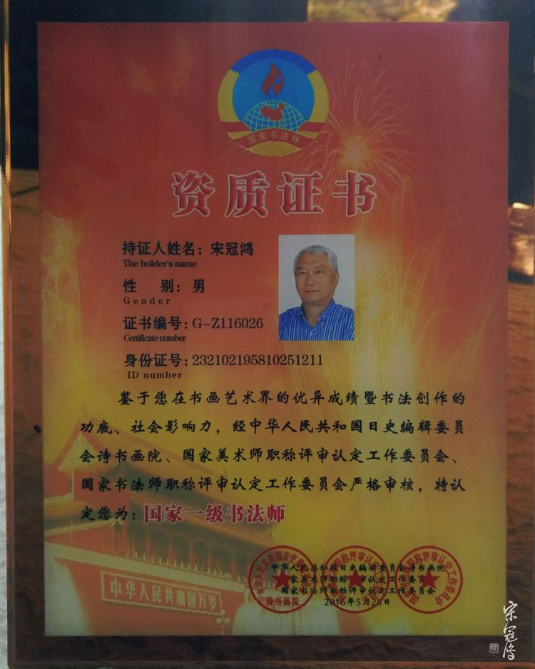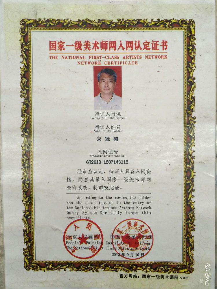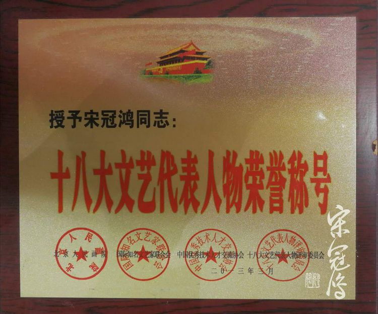 宋冠鸿, 1958年生, 中国传统美学大师, 十八大文艺代表人物, 文艺界最具代表性的文艺大家, 中国当代首选书法名家。中国杰出书画艺术名家最高荣誉成就奖获得者, 文化强国国家文化传承贡献奖, 青花杯中国传统文化最高成就奖。 国家一级美术师, 世界书画家资格考核一级书法师。